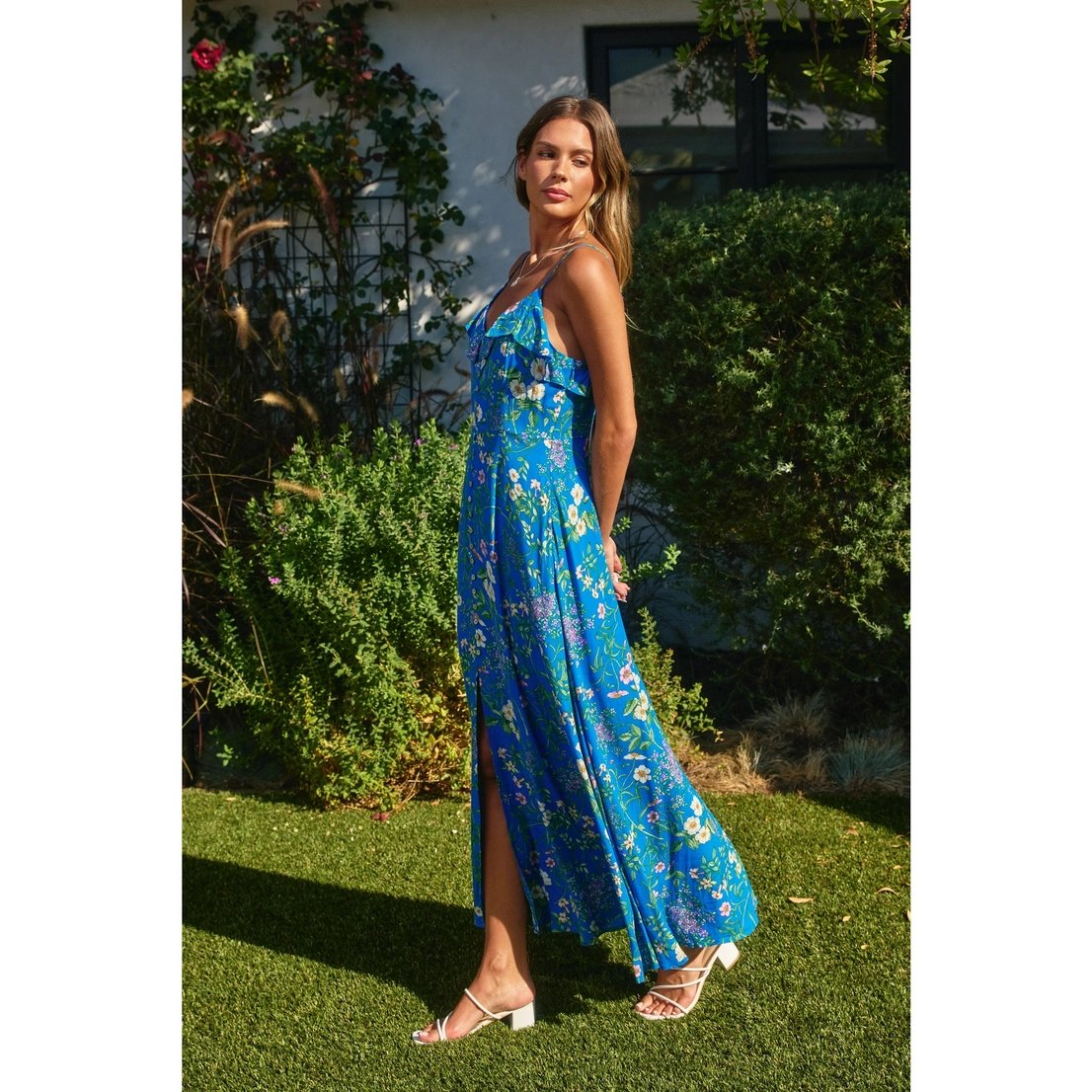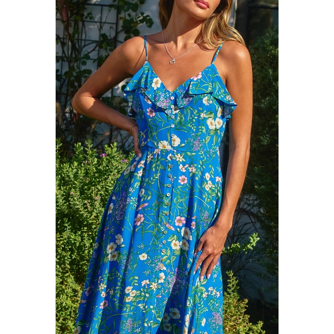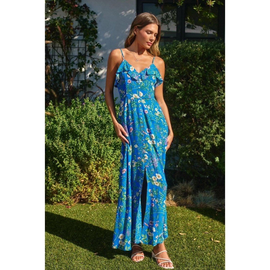 Floral print maxi dress with a flowy bottom. Model is 5'8" and wearing size Small. - Ruffled neckline - Front button placket with slit on the bottom - Cutout detail on the back - Elasticized backband with ruffle trim - Hidden side zipper closure - Lined Shell: 55% Viscose, 45% Rayon Lining: 100% Polyester